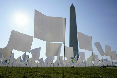 9月15日,美国华盛顿国家广场插满了白旗,哀悼死于新冠病毒的美国人。(图片来源:美联社)