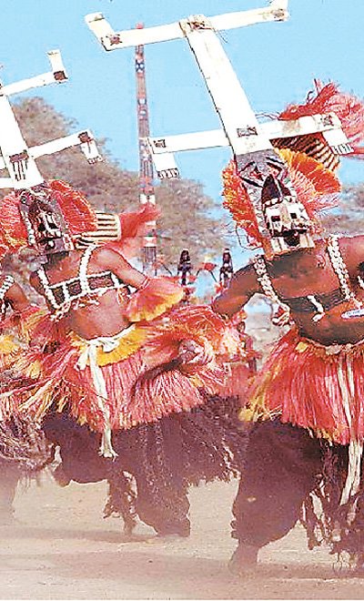 在马里北部的加奥、基达尔和通布图等地以及中东部的莫普提地区,还有许多值得探索的非物质文化遗产:传统知识、手工技能、口头文学、歌谣、仪式以及其他一些珍贵的传统工艺……其中,多贡面具舞是一颗充满神秘魅力的明珠。尼日尔河流经马里的河湾处,居住着黑人土著民族——多贡人。他们在陡峭的悬崖上筑起尖顶泥屋,层层叠叠,如蜂窝一般。悬崖上几乎没有路,多贡人只能手脚并用,踩着石头往上爬。交通闭塞让这个古老的民族几百年来与世隔绝,但也因此保存了最为原生态的传统文化。在重大仪式、节庆上演的面具舞彰显了多贡人对自然、对生命的炽烈情感。