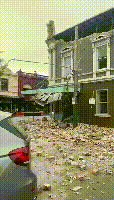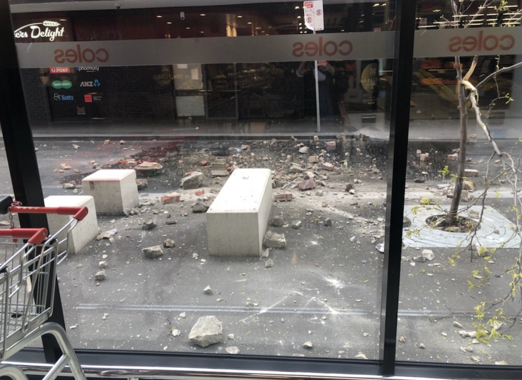 现场视频显示,墨尔本市教堂街上的建筑物受损严重,街道上出现大面积的建筑物碎块。教堂街聚集了大型商场和众多餐馆,其中一幢建筑的房顶侧面墙体完全塌落,地面散落大量砖块,连接的电缆被压断,挡住了附近来往的车辆。路过的行人看到这副场景,纷纷驻足围观,并拿出手机记录下这些画面。