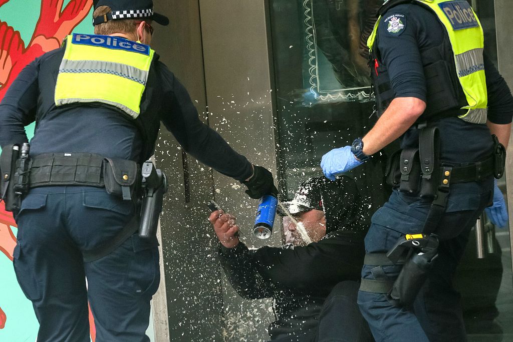 据澳大利亚天空新闻网22日报道,当天上午,数百名抗议人士聚集墨尔本市中心的战争纪念馆,反对强制建筑行业从业者接种新冠疫苗,当地武警出动维持秩序。随着警方逼近,抗议群体的情绪逐渐高涨起来。在民众与警方的对峙过程中,警察向抗议者喷辣椒水,多人被强制拖走,一名女子倒地后被警方拷走。