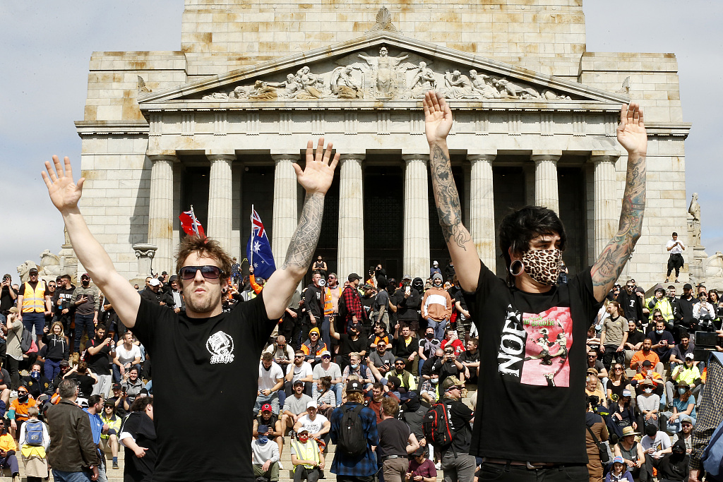 维多利亚州警察署当日发布公告,要求抗议人士不要在战争纪念馆附近集会。然而,当天下午仍有大批抗议者前往纪念馆集会示威。(海外网 汪晓宇)