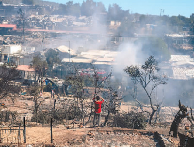 2020年9月9日凌晨,位于莱斯沃斯岛的希腊最大难民营莫里亚难民营发生火灾,数以千计的难民和非法移民逃离。图为一名儿童在火灾过后的难民营建筑附近查看。 新华社/美联