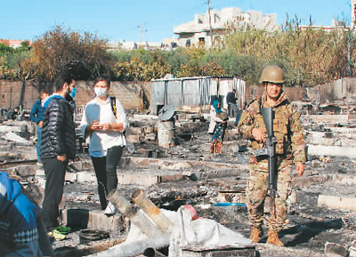 2020年12月26日,黎巴嫩北部明耶地区发生当地民众与叙利亚难民之间的冲突,造成至少5人受伤、约100个帐篷被烧毁。图为12月27日,一名黎巴嫩士兵在被烧的难民营执勤。