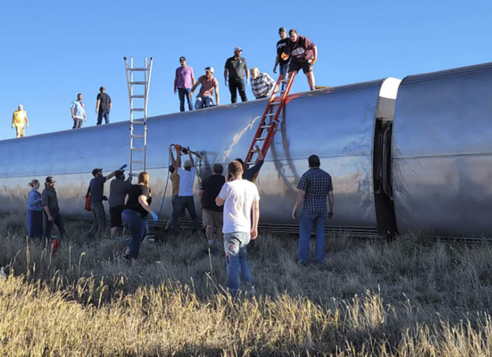 海外网9月26日电 据福克斯新闻报道,当地时间9月25日下午,美国全国铁路客运公司一列火车在蒙大拿州脱轨,造成至少3人死亡,50多人受伤。现场画面显示,许多乘客爬上车顶后,利用梯子逃生。