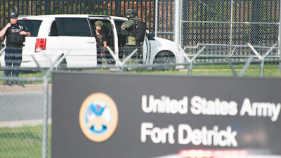 4月6日,美国特警人员准备进入德特里克堡军事基地。该基地是美国陆军医学研究与发展司令部和美国陆军传染病医学研究所所在地。
