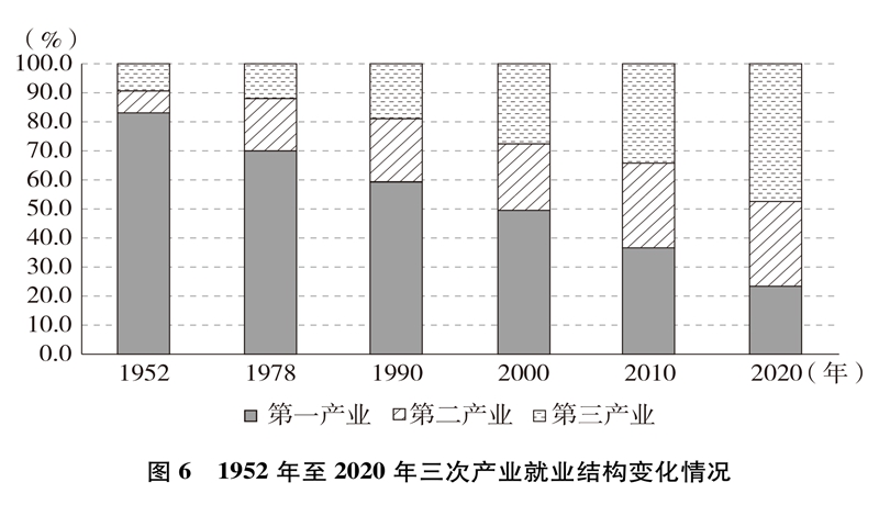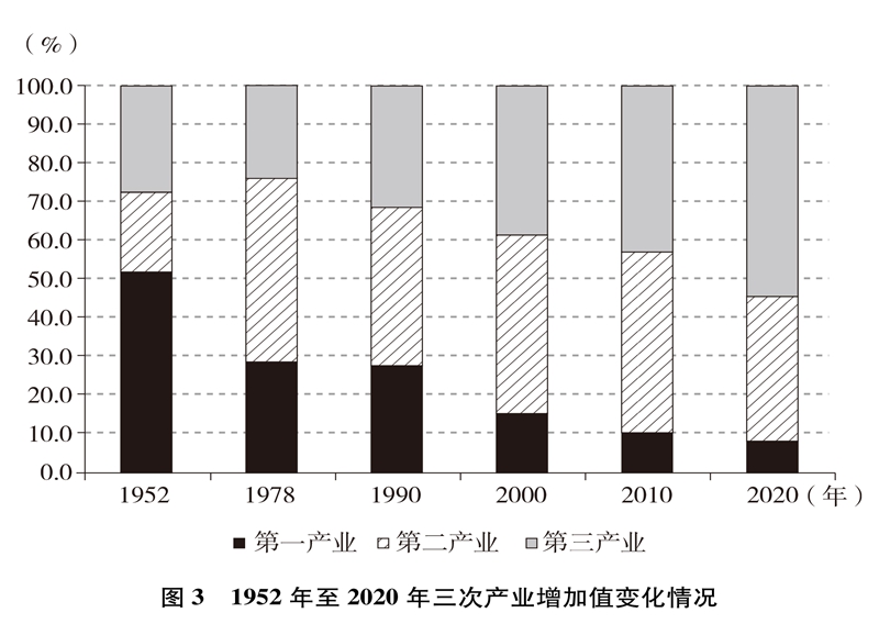 产业结构优化升级。中国已建成世界上最完整的产业体系,产业发展持续向中高端迈进。三次产业增加值之比从1952年的50.5∶20.8∶28.7到2020年的7.7∶37.8∶54.5,中国从传统农业大国成为工业大国、服务业大国(图3),中国经济从依赖单一产业为主转向依靠三次产业共同带动。农业现代化成效显著,机械化、数字化、绿色化、功能化、共享化水平明显提高,广大农民逐步告别“面朝黄土背朝天、一身力气百身汗”的辛劳,农村生产力极大解放;粮食生产能力稳步提升,实现谷物基本自给,中国人把饭碗牢牢端在自己手中。中国建成门类齐全、独立完整的现代工业体系,工业化和信息化融合发展的广度和深度不断拓展,“中国制造”向“中国智造”转型升级,产业链供应链现代化水平进一步提升。以新一代信息技术、生物技术、高端装备、绿色环保为代表的战略性新兴产业发展迅速,成为引领高质量发展的重要引擎。数字经济激发经济发展新活力,产业数字化和数字产业化趋势加快。现代服务业加速发展,以“互联网+”为标志的新业态、新模式层出不穷,平台经济、共享经济蓬勃兴起,生产性服务业向专业化和高端化发展,生活性服务业向精细化和高品质转变。产业结构的优化升级促进了经济更加均衡、更加充分的发展,人们个性化品质化多样化需求不断得到满足。