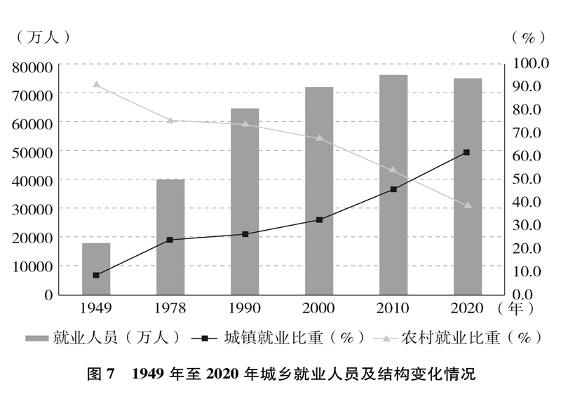 就业局势长期稳定,就业质量显著提升。就业人数从1949年的1.8亿增加到2020年的7.5亿,就业规模不断扩大;从绝大多数劳动者以农业为生到第三产业就业人数占47.7%(图6)、城镇就业人数占61.6%(图7),就业结构不断优化;从劳动者普遍处于文盲半文盲状态到劳动年龄人口平均受教育年限10.8年、技能人才总量约2亿,就业人员素质大幅提高。亿万劳动者拥有自己热爱的工作,开启幸福生活的大门。从计划分配到市场就业、自由择业、自主创业,从传统就业方式到新就业形态,劳动者的就业观念深刻变革、就业空间更加广阔、就业方式日益多元。人们的兴趣爱好、特长禀赋与个人就业意愿、社会需求、国家需要更好结合,自我价值更好实现,主动性创造性显著增强,创新创造热情不断迸发。劳动者合法权益得到保障,劳动报酬保持增长,劳动所得受到保护,人们越来越有尊严地劳动、快乐地劳动,依靠自己的双手创造美好生活。从“单休制”到“双休制”,从“黄金周”到带薪年休假,劳动者休息休假权益越来越有保障,工作生活更加平衡。劳动最光荣、最崇高、最伟大、最美丽日益成为全社会的共识和行动,勤奋做事、勤勉为人、勤劳致富成为风尚,崇尚劳动、尊重劳动、热爱劳动的社会氛围更加浓厚。