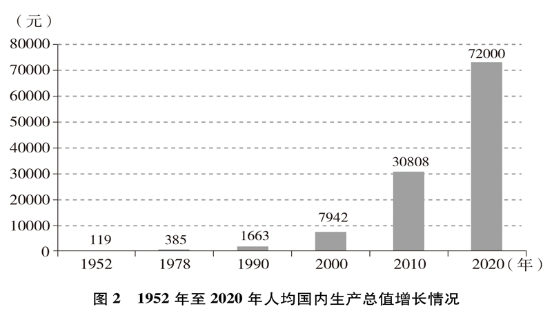 经济实力大幅提升。中国国内生产总值从1952年的679.1亿元跃升至2020年的101.6万亿元,经济总量占全球经济比重超过17%,稳居世界第二大经济体(图1)。人均国内生产总值从1952年的几十美元增至2020年的超过1万美元,实现从低收入国家到中等偏上收入国家的历史性跨越(图2)。制造业增加值多年位居世界首位,220多种工业产品产量居世界第一,自2010年起连续11年位居世界第一制造业大国。中国已是全球货物贸易第一大国、服务贸易第二大国、商品消费第二大国、外汇储备第一大国,2020年利用外资居全球第一。不断迈向共同富裕的14亿多人口,其中有超过4亿并不断扩大的中等收入群体,是全球最具成长性的超大规模市场,中国经济充满活力,具有巨大潜力和充足后劲。2020年,中国率先控制新冠肺炎疫情,率先复工复产,率先实现经济增长由负转正,充分彰显中国经济的强劲韧性。