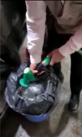 有民众被拍到用套着垃圾袋的桶囤油。(视频截图)