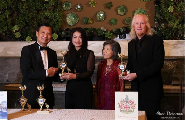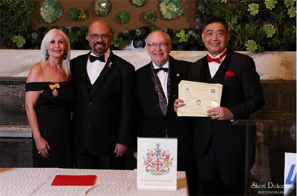 △蒙市前市长刘达强(左1)向奥斯卡两次金像奖获得者Paul Ottoson(右1)、国际著名演奏家韩华琦(左2)颁奖