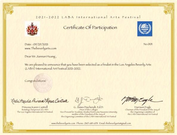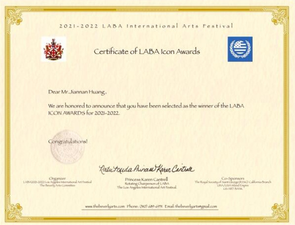 △黄建南获得的《LABA国际艺术节公益标志奖证书》