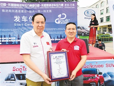 陈新军(右)在二〇一八年中国-东盟国际汽车(老挝站)拉力赛上留影。老挝金仕达汽车有限公司是当年中国—东盟国际汽车(老挝站)拉力赛承办方。 受访者供图