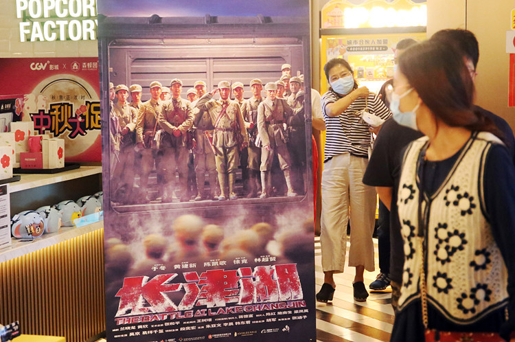 上海某影城内,观众驻足观赏电影《长津湖》海报。(图源:视觉中国)