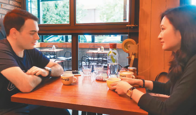 图为梁曼瑜(右)采访在中国讲授咖啡文化的希腊青年。 (受访者供图)