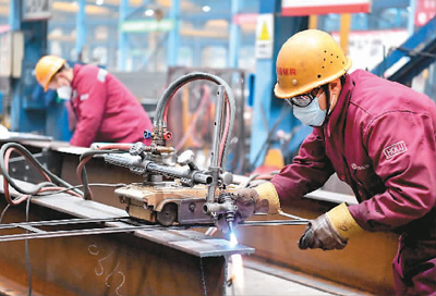 安徽省亳州市涡阳县实施工业强县战略,着力打造绿色装配式建筑产业集聚区,构建现代产业体系,推动全县经济总量不断提升。图为日前工人在一家钢构企业生产车间里忙碌。