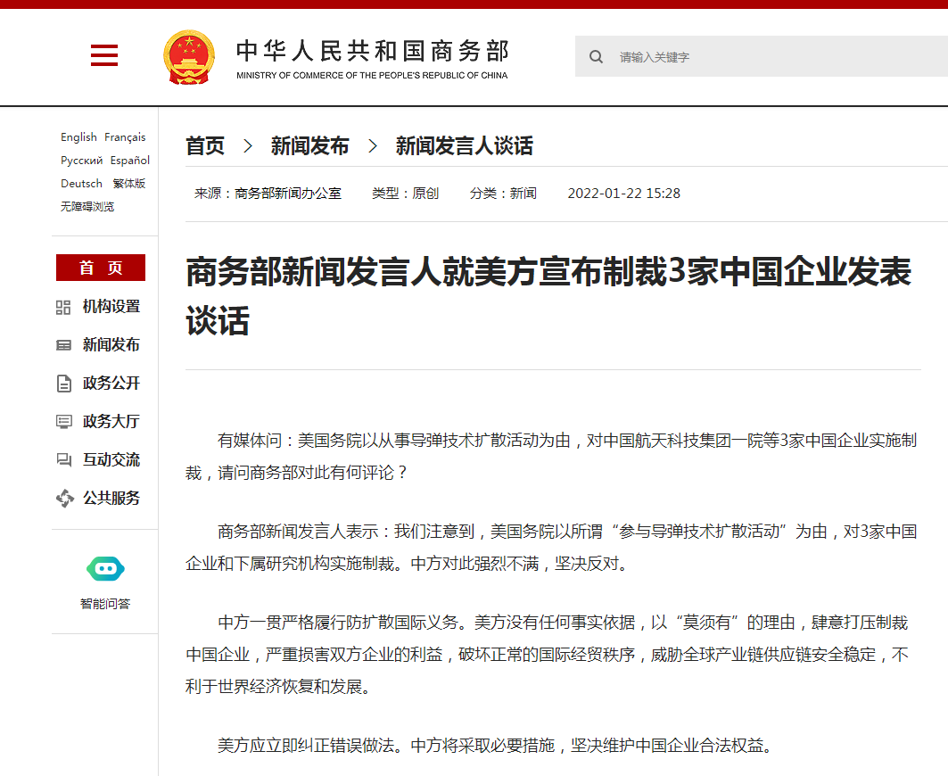 商务部新闻发言人就美方宣布制裁3家中国企业发表谈话