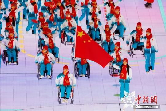3月4日,北京2022年冬残奥会开幕式在北京国家体育场举行。图为中国代表团入场,由运动员郭雨洁(前排右)、汪之栋(前排左)担任旗手。 中新社记者 韩海丹 摄