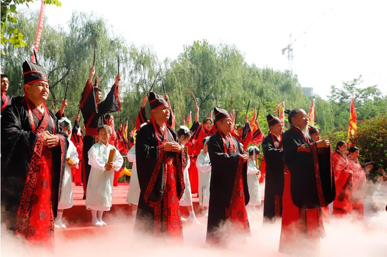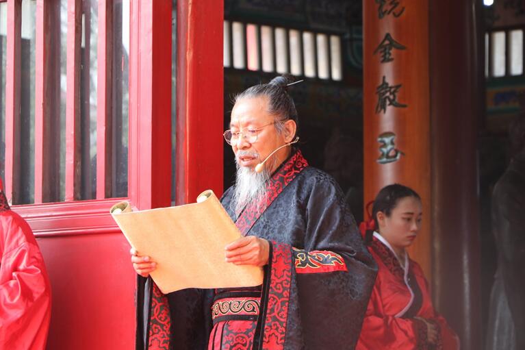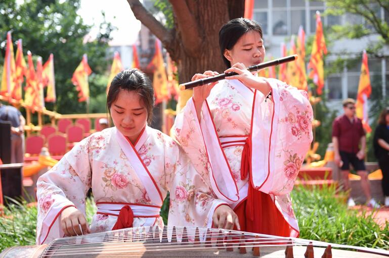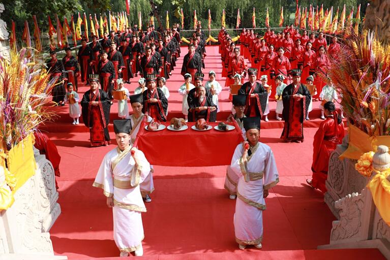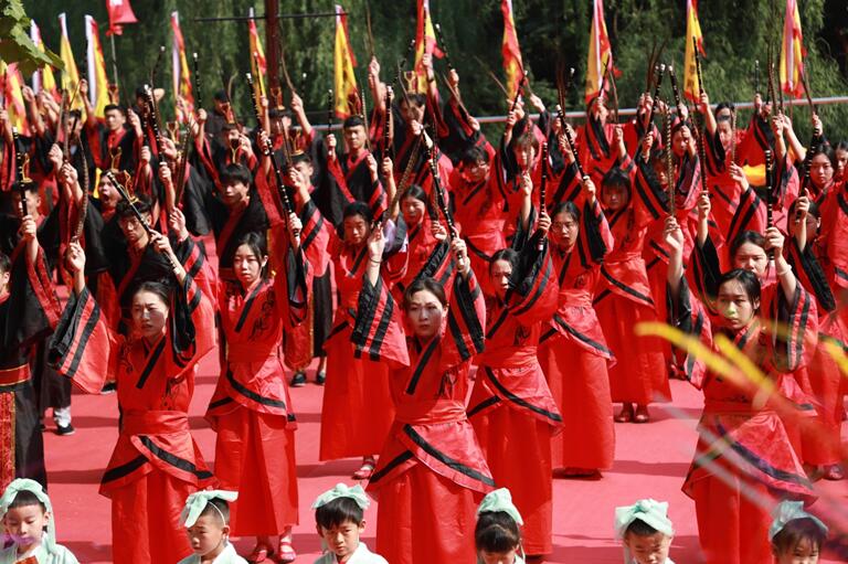 校园内文庙红绸装点,彩旗飘扬,古风汉韵,焕然一新。师生们着汉服,肃立大成殿前,恭祭吾华夏圣师。古乐团的编磬、编钟、古筝奏响悠扬的祭祀雅乐。64位八佾舞者身着鲜红色古制式礼服,手执雉翟,踏乐起舞,动作庄严齐一。