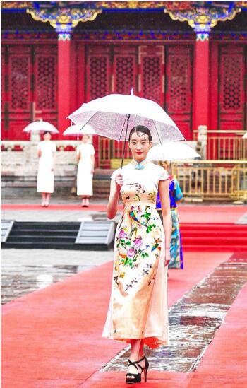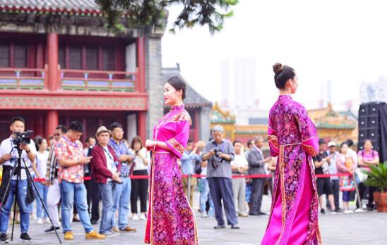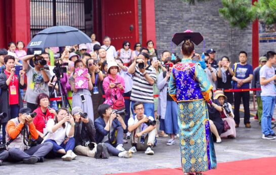 6月19日中午,参加沈阳全力打造东北亚“四个中心”2018中国沈阳全球发布会议活动的海外媒体代表们在故宫观看盛京满绣旗袍展示。