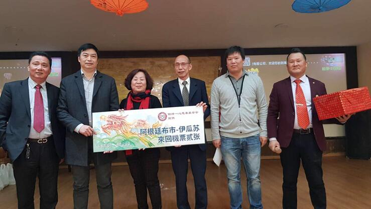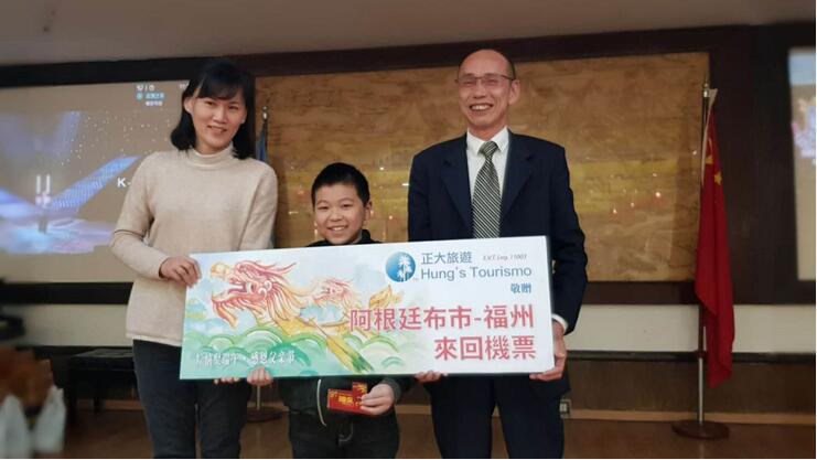 当晚最大奖项为布宜诺斯艾利斯市飞往福州的往返机票。图为端午联欢晚会中抽得头奖的嘉宾。