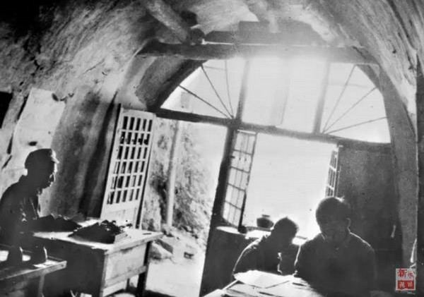 延安时期新华社编辑在窑洞内工作。