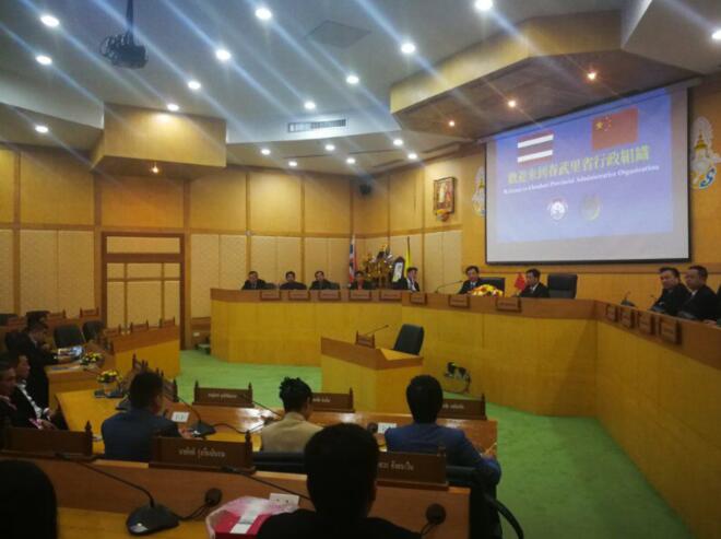 张家界市委副书记刘绍建(右)与泰国春武里府省长威塔亚(左)亲切交流
