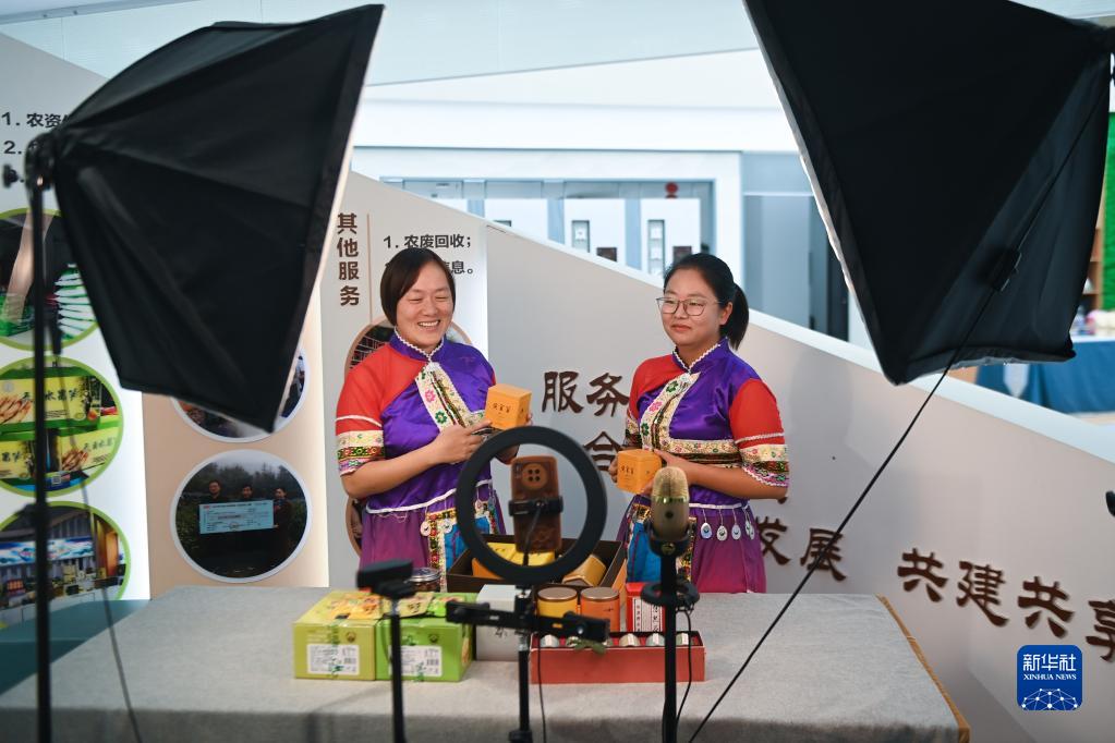 2022年10月25日,杭州市临安区太湖源镇众社村的畲族青年吕欣(左)、龚海燕在电商直播中心进行线上直播,销售当地土特产。新华社记者 徐昱 摄