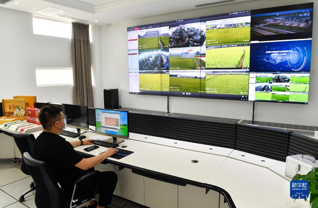 在吉林市孤店子镇东福米业现代农业信息化监视指控中心,工作人员通过监控系统查看稻田情况(2020年8月13日摄)。新华社记者 许畅 摄