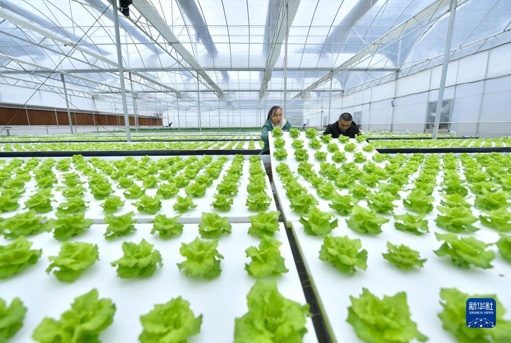 2022年11月29日,湖北省宣恩县椒园镇锣圈岩村的农民在温控大棚里检查水培蔬菜的生长情况。新华社发(宋文摄)