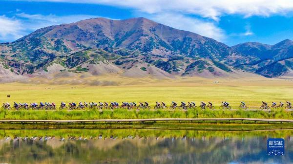 图为自行车赛选手在新疆赛里木湖国家湿地公园骑行(图源:新华社)