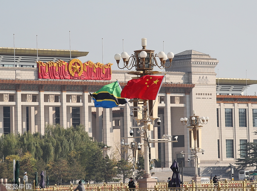 2022年11月3日,北京天安门广场悬挂中国和坦桑尼亚两国国旗,欢迎坦桑尼亚总统哈桑对中国进行国事访问。(图源:视觉中国)