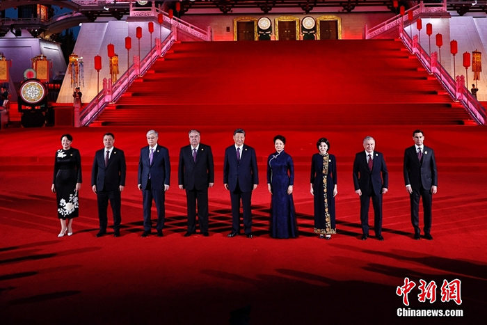 中新社西安5月18日电 (记者 梁晓辉)5月18日晚,中国国家主席习近平和夫人彭丽媛在陕西省西安市大唐芙蓉园为出席中国—中亚峰会的中亚国家元首夫妇举行欢迎仪式和欢迎宴会。