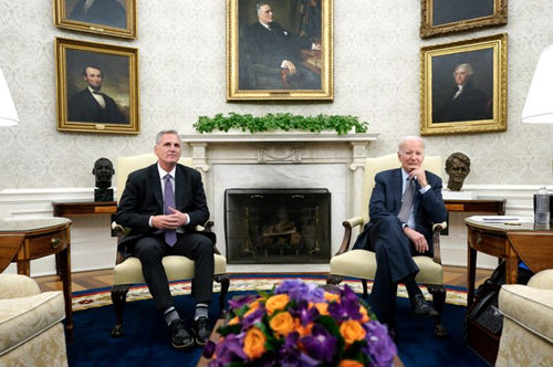 资料图:美国总统拜登与国会众议院议长麦卡锡就债务上限问题进行谈判。(图片来源:美联社)