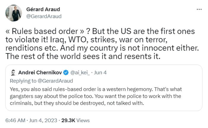 在另一条推文中,阿罗指出,从美国在伊拉克战争、世贸组织违规、所谓“反恐战争”中的表现可见,是美国首先违反了“基于规则的秩序”。世界上其他国家看到了这一点,对此感到愤慨。