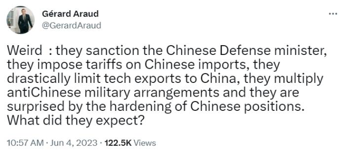 中新网6月5日电 日前,法国前驻美大使热拉尔·阿罗在推特上提出一个值得思考的问题,“奇怪,他们(美国)制裁中国国防部长,他们对中国进口商品征收关税,他们大幅限制对华技术出口……现在他们反而对中国立场的强硬感到惊讶。美国到底想要什么?”