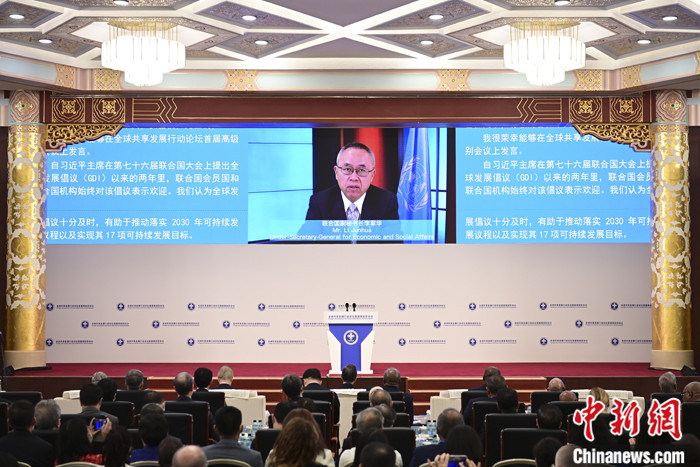 7月10日,全球共享发展行动论坛首届高级别会议在北京开幕。联合国副秘书长李军华在开幕式作视频致辞时指出,实施2030年可持续发展议程的时间框架已过半,但只有约12%的可持续发展目标有望在2030年之前实现,联合国呼吁各会员国加大投入,为有需要的国家增加可负担的长期发展融资。 中新社记者 田雨昊 摄