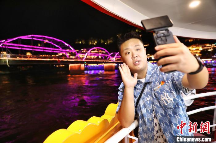 7月16日,“丝路风采 如意甘肃”海峡两岸记者联合采访活动在甘肃兰州启动。图为台湾自媒体人林惟纲在“黄河第一桥”——中山桥下拍摄短视频。 中新社记者 李雪峰 摄