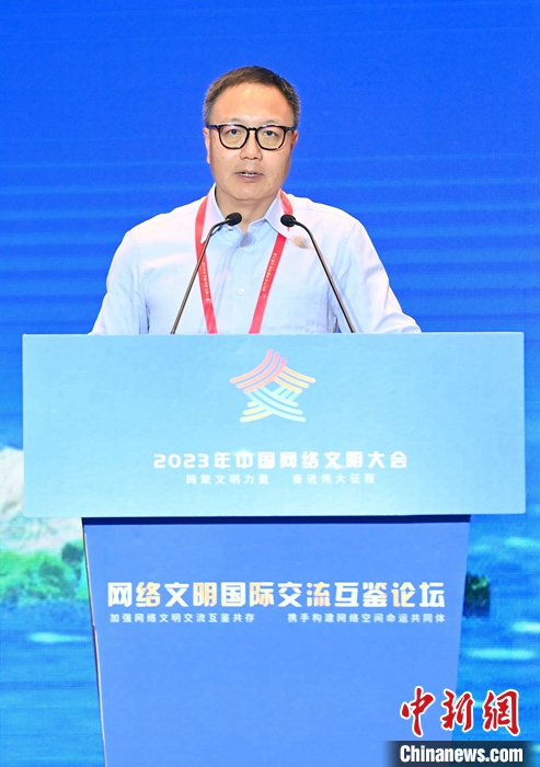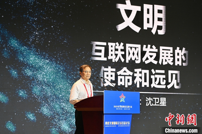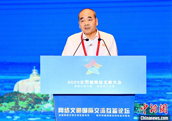 7月18日,2023年中国网络文明大会网络文明国际交流互鉴论坛在厦门举办。图为光明日报原副总编辑、浙大城市学院文明与传播研究院研究员沈卫星作主题演讲。中新社记者 王东明 摄