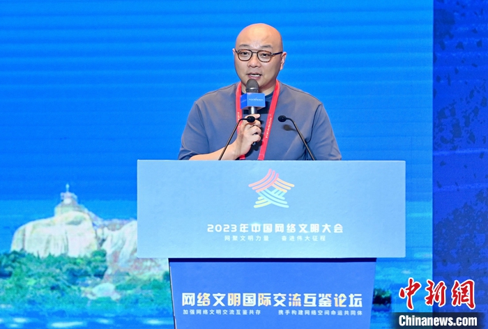 7月18日,2023年中国网络文明大会网络文明国际交流互鉴论坛在厦门举办。图为完美世界首席执行官萧泓作主题演讲。中新社记者 王东明 摄