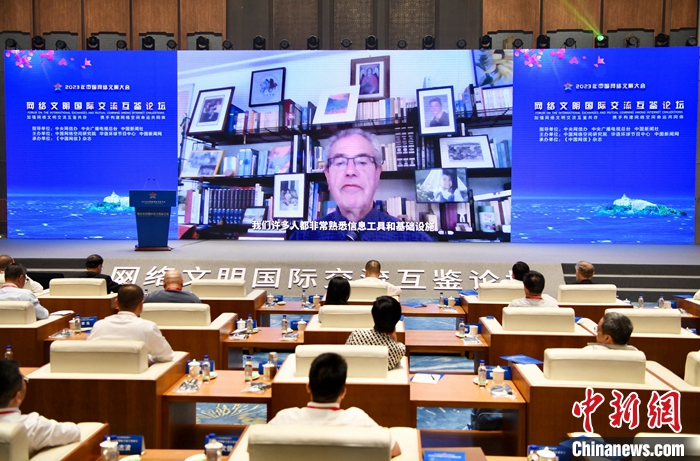 7月18日,2023年中国网络文明大会网络文明国际交流互鉴论坛在厦门举办。图为比利时国际联合倡议多边合作组织荣誉主席米歇尔·杰诺韦塞作视频演讲。中新社记者 王东明 摄