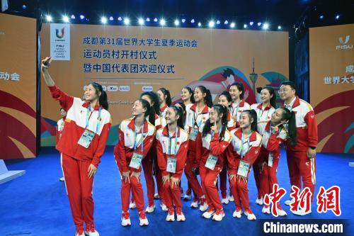 7月22日,成都第31届世界大学生夏季运动会运动员村正式开村,并为首支入住的代表团——中国大学生体育代表团举行了欢迎仪式。图为成都大运会中国大学生艺术体操队队员在欢迎仪式现场拍照留念。 中新社记者 安源 摄