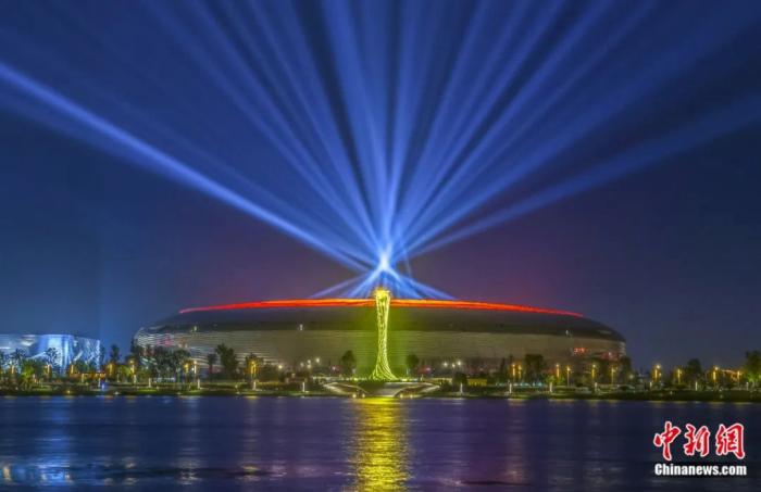 四川成都东安湖体育公园,第31届世界大学生夏季运动会主体育场亮灯。张国盛 摄