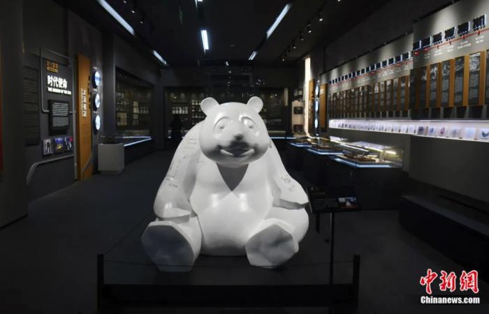 四川成都大运会博物馆展出的大熊猫雕塑。张浪 摄