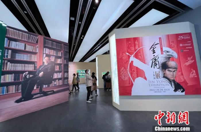 2022年,观众在上海图书馆观看金庸展。此次金庸展展览面积近1000平方米,展出了金庸先生的手稿、私人物品、漫画、画作以及众多版本的小说等,展品多达近300件。周东潮 摄