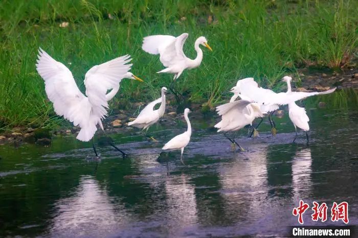 资料图:在山东省日照市五莲县洪凝河,白鹭在翩翩起舞。王义全 摄