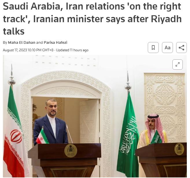 中新网8月18日电 据路透社报道,当地时间17日,伊朗外交部长阿卜杜拉希扬在利雅得会见沙特外交大臣费萨尔后称,双方会谈成功,两国修复关系的工作取得进展。