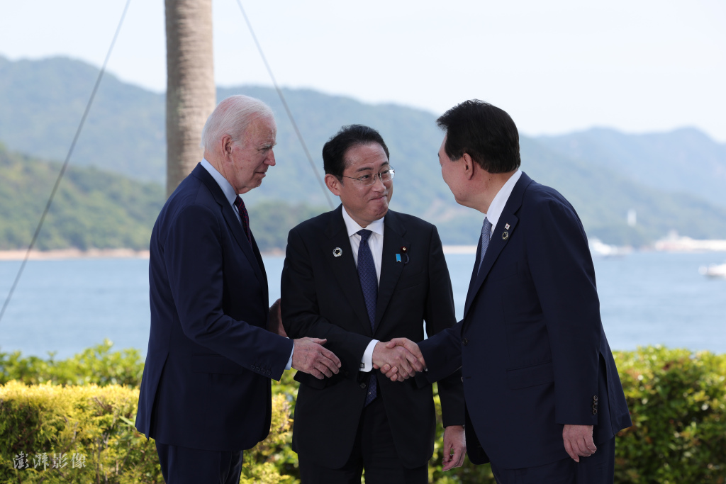 资料图:当地时间5月21日,日本广岛G7峰会期间,美国总统拜登、日本首相岸田文雄、韩国总统尹锡悦举行三方会谈。(图/澎湃影像)
