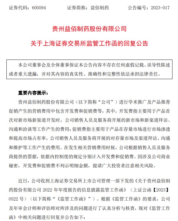 2023年6月,益佰制药收到上交所年报监管函,被要求补充披露销售费用前五大支付对象;学术推广、营销平台建设等市场费用主要核算内容明细情况;销售费用支付对象中是否涉及公司经销商、关联方或其他利益相关方等相关信息。
