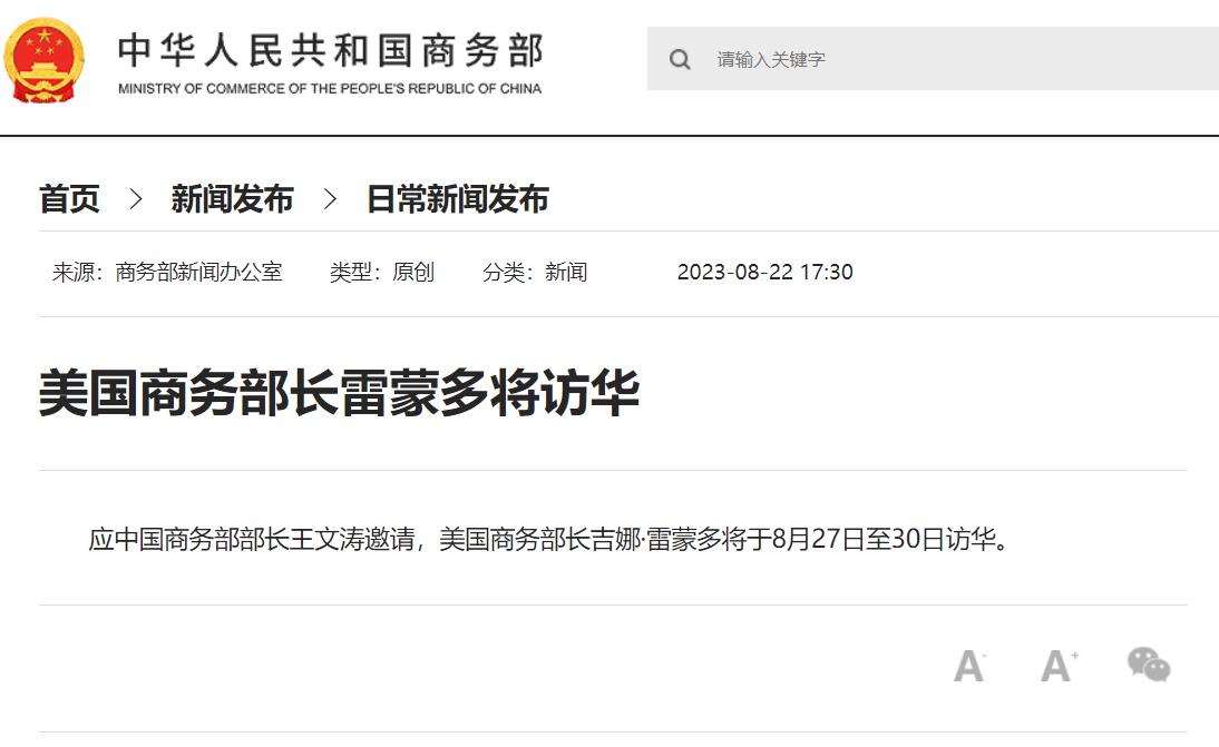 应中国商务部部长王文涛邀请,美国商务部长吉娜·雷蒙多将于8月27日至30日访华。
