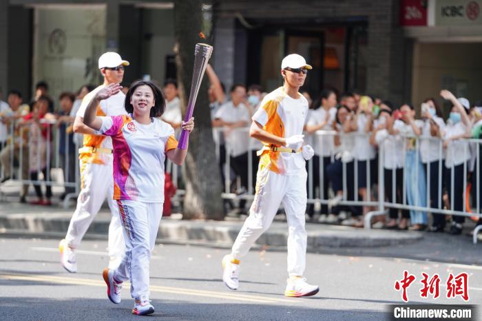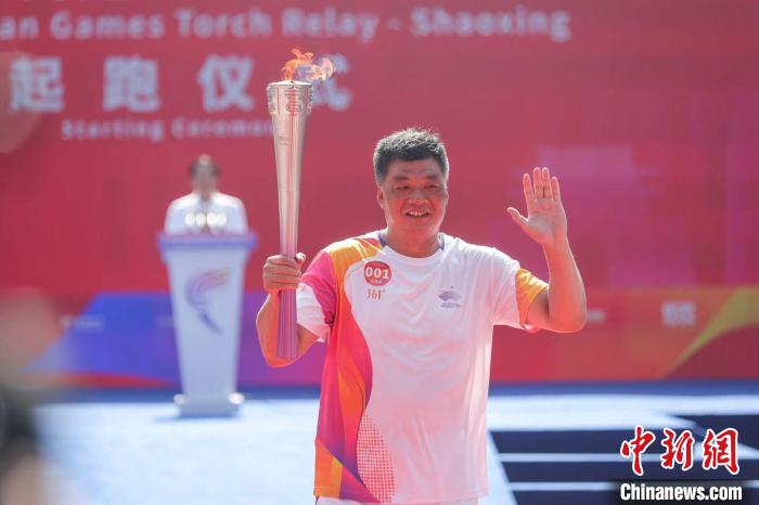 杭州亚运会火炬传递绍兴站第1棒火炬手俞觉敏。杭州亚组委官方摄影供图